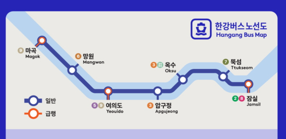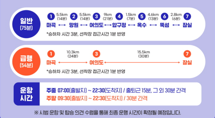 - 운항 노선/시간: 체험 기간에는 여의도→뚝섬→잠실 편도, 화·목요일 2회, 토요일 1회 운항해요.