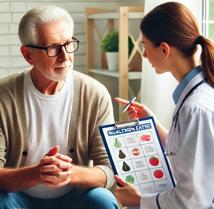 영양사의 설명을 듣고 있는 할아버지