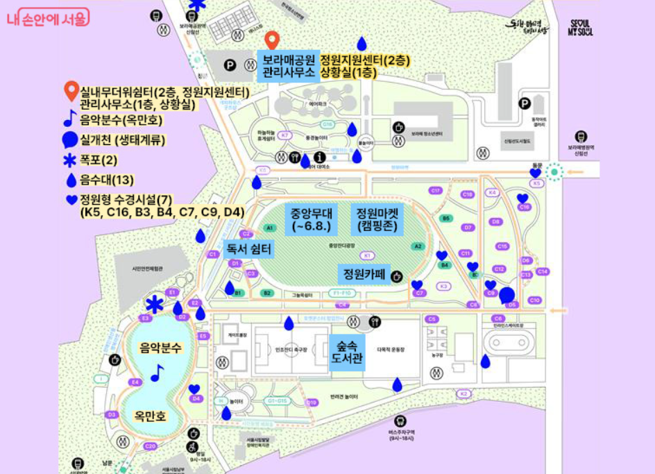- 무더위쉼터 운영: 보라매공원은 9월 말까지 저녁 6시~11시 무더위쉼터로 운영되며, 다양한 시설 운영 시간이 연장돼요.